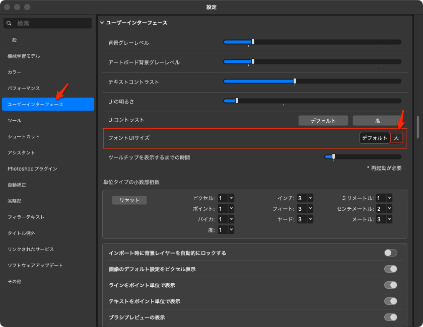 メニューから「Affinity->設定…」を選択して「ユーザーインターフェイス」から「フォントUIサイズ」で「大」を選択するとフォントが見えやすくなる。