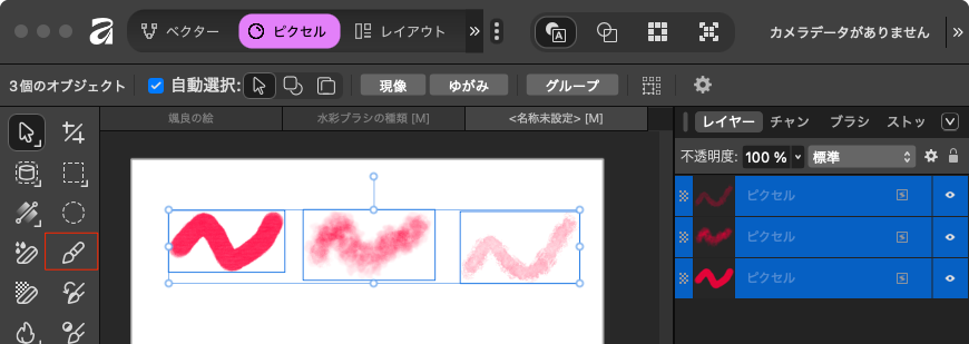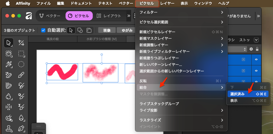 以下のように「ピクセルスタジオ」を選択してブラシで3つのオブジェクトを作成。そうすると右側に3つのレイヤーがあるのを確認。これを結合する