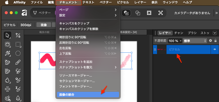 ベクターオブジェクトではなく、ピクセルレイヤー(ラスター画像)を完全に1つに結合したい場合は、「マージ」や「結合」操作を行う。