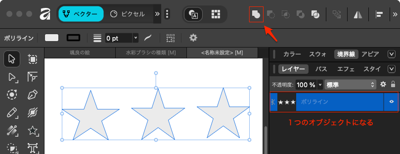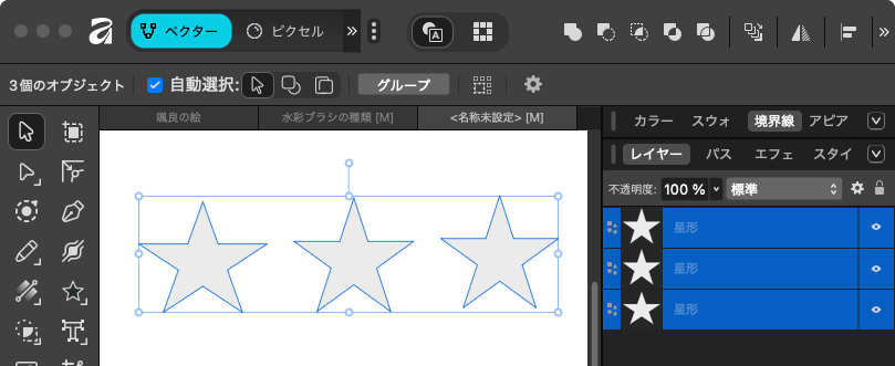まず、結合したいすべてのオブジェクトを選択。この時点で右側に3つのレイヤーがある状態。