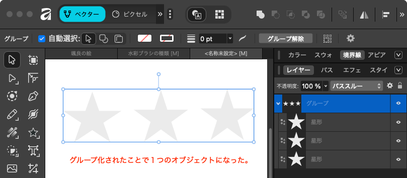 ほとんどの場合、ベクターオブジェクトを扱っているかと思うので、まずは「グループ化」を試す。