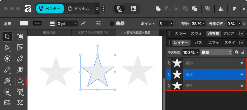 Affinityアプリケーションでは、1つの描画ツール(例:長方形ツール、楕円ツール)がアクティブな状態では、マウスをクリックするたびに、別の新しいオブジェクトを作成することができる、それらのオブジェクトは個別のレイヤーとして扱われる。