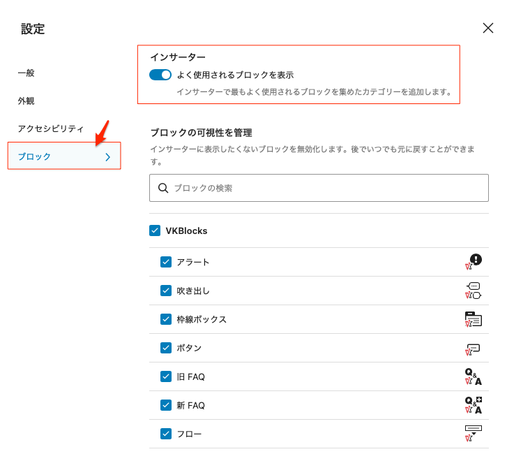 インサーターでよく使われるブロックを表示する