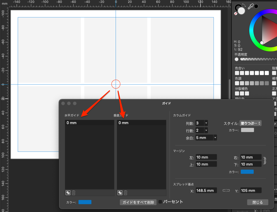 作成されたガイドをダブルクリックするとガイドの設定ウインドウが出るので、色の変更や削除ができるようになる。
