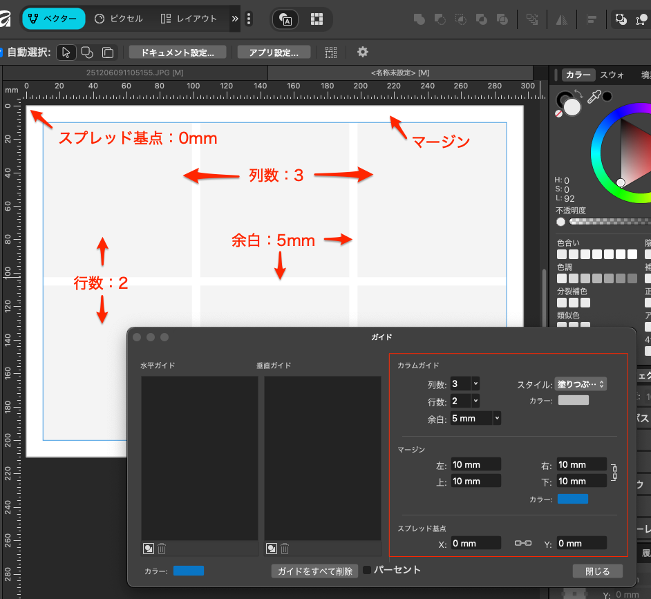 水平と垂直ガイド、カラムガイドとマージン、スプレッド基点を設定することができる。