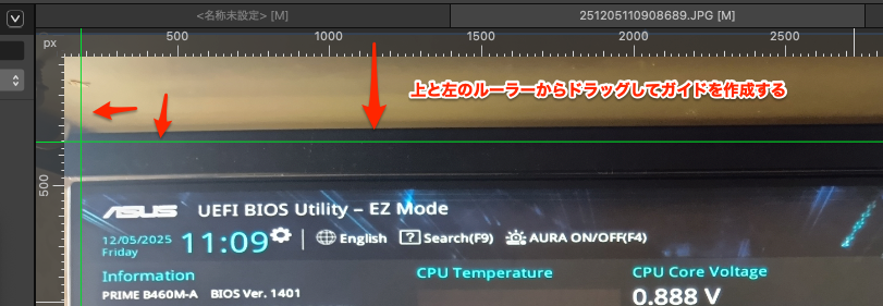その表示されたルーラーから下または左からドラッグするとガイドが表示される。
