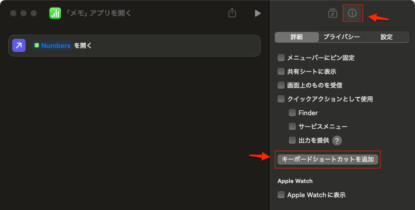 今回は、キーボードショートカットでアプリを開くので、右上の「ショートカットの詳細」タブを選択して、「キーボードショートカットを追加」ボタンをクリック。