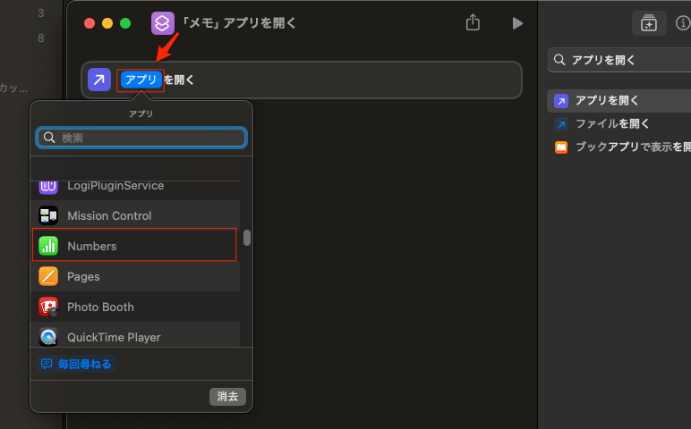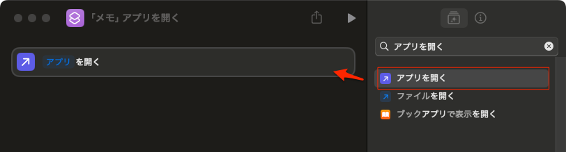 「アプリを開く」で検索して、「アプリを開く」をドラッグまたダブルクリックで左に入れる。