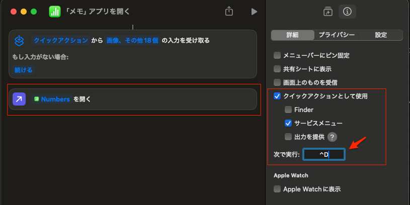 左にNumbersを開くが自動的に配置され、右側で「クイックアクションとして使用」に自動的にチェックが入る。「サービスメニュー」も同じようにチェックが入る。