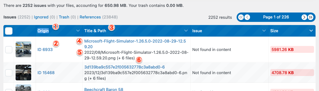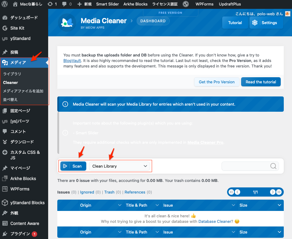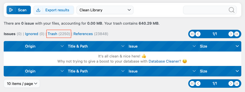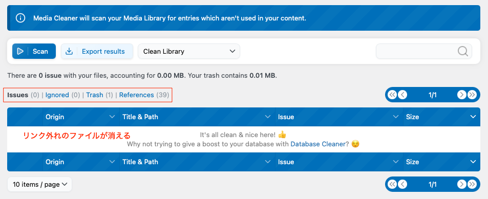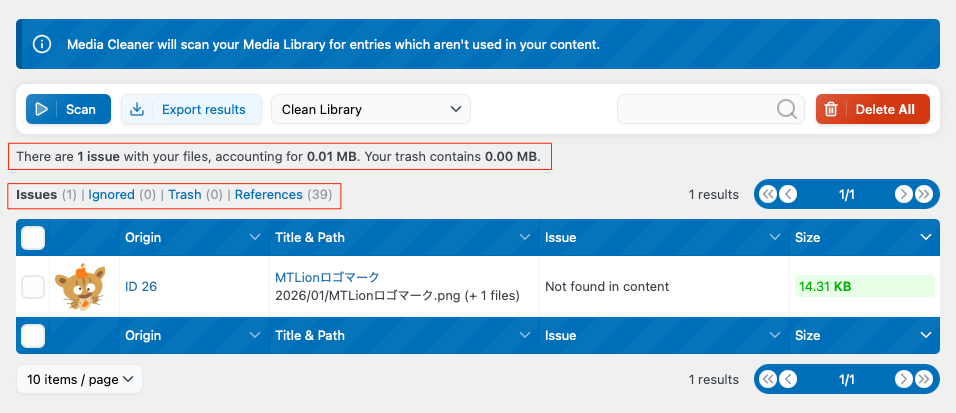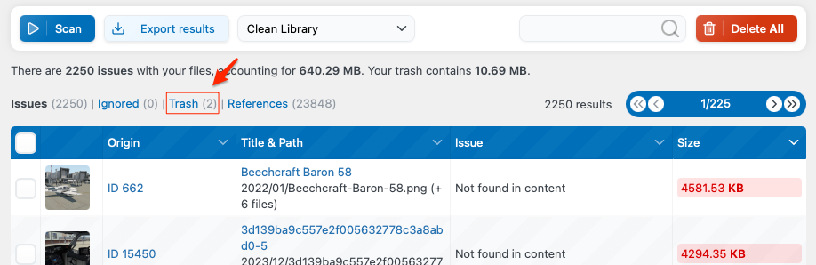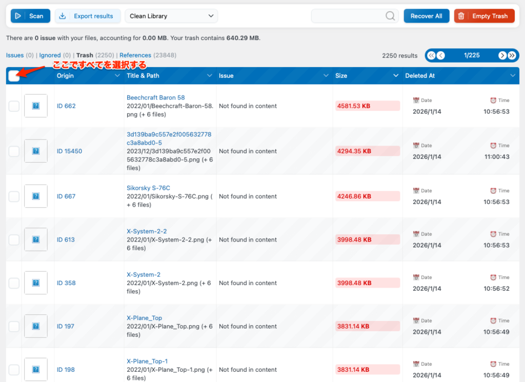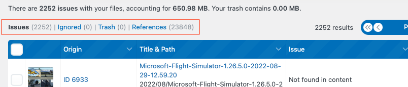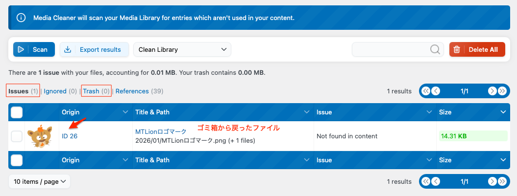 Issues:問題」はウェブサイトのコンテンツで使われていないと判断されたメディアファイルを指し、これらのファイルは安全に削除できるよう一時的な「Trash:ゴミ箱」へ移動させることがきる。