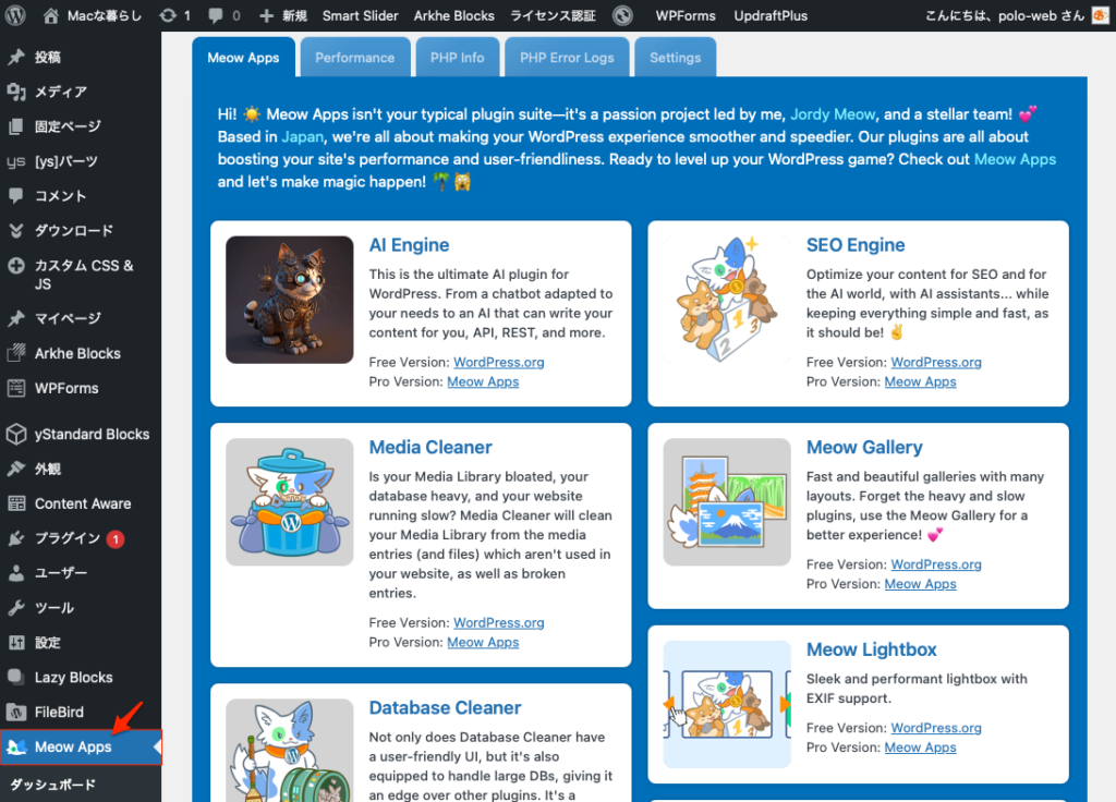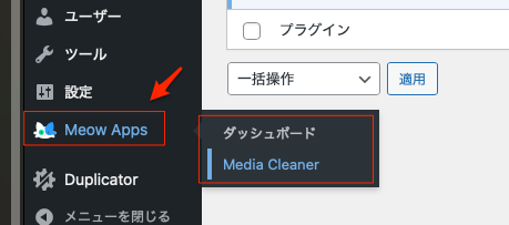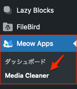左サイドメニューから、Meow Appsを選択、オンマウスをして、Media Cleanerをクリック。