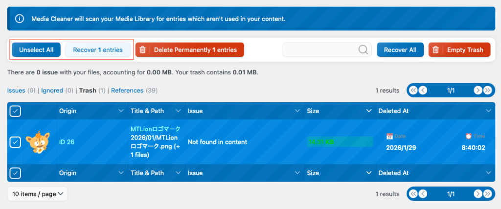 これを確認するには、一度 Media Cleaner で「Recover 1 entries」で復元するとメディアライブラリの数が増えるので、戻ったことが分かる。