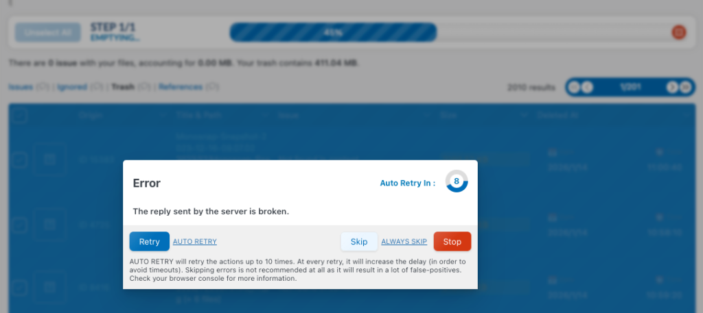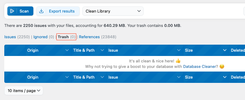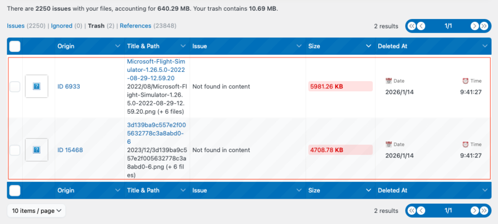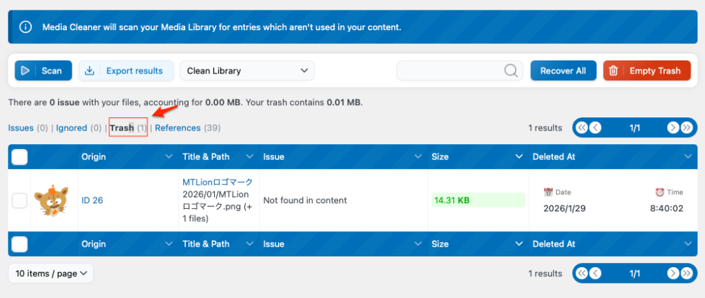 もし余裕があるなら、Media Cleanerのゴミ箱機能(Trash)に一度移動させ、サイトを数日間注意深くチェックして、画像が表示されなくなったり、機能が損なわれたりしていないか確認することが大事。