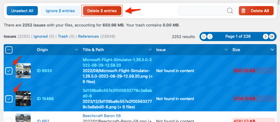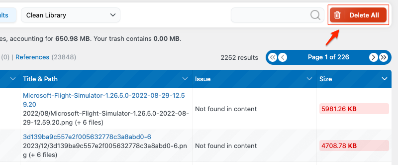 分析結果画面で不要なファイルを選択して「Delete」をクリックします。デフォルト設定では、削除したファイルは一度メディアライブラリのゴミ箱へ送られ、復元可能です。