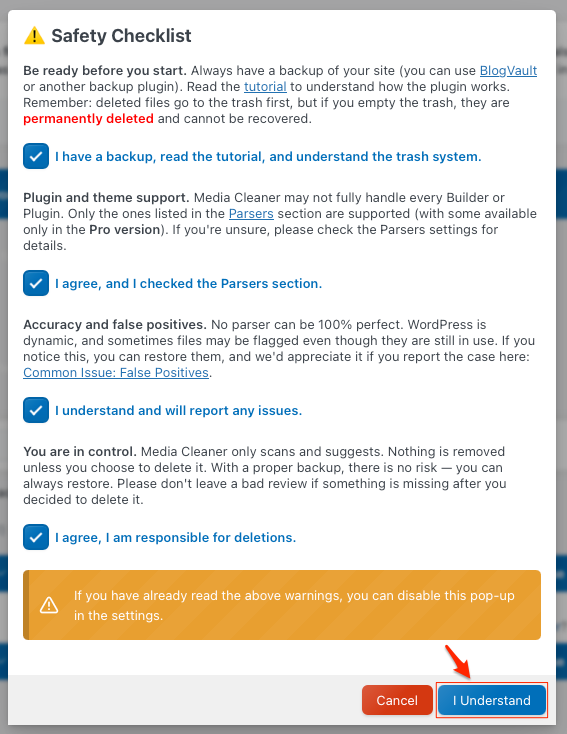 Be ready before you start. Always have a backup of your site (you can use BlogVaultor another backup plugin). Read the tutorial to understand how the plugin works. Remember: deleted files go to the trash first, but if you empty the trash, they are permanently deleted and cannot be recovered.
