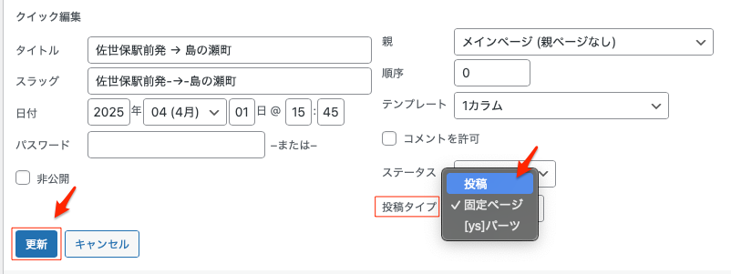 右下の投稿タイプからプルダウンで「固定ページ」を「投稿」へ変更して、更新をクリック。