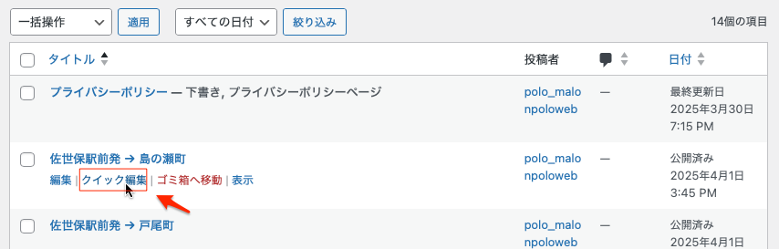 例えば、固定を投稿に変更したい場合。固定ページの一覧から変更したいページにマウスを持っていくと、「クイック編集」が出るのでそれをクリック。