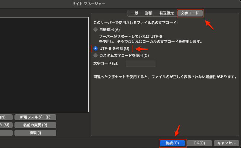 多くの文字化けは、FTPの文字セットとサーバーの文字コードの不一致が原因で、この設定でほとんどの日本語ファイル名が正しく表示されるようになる。