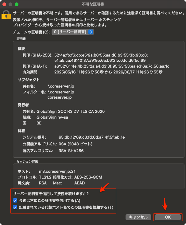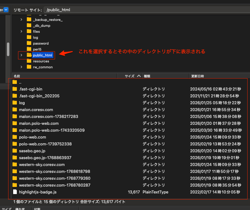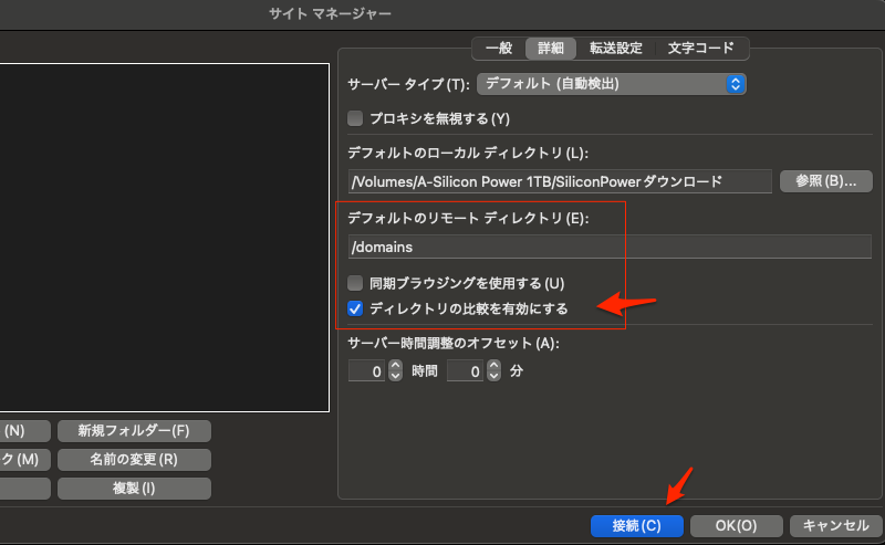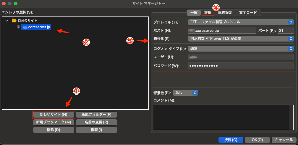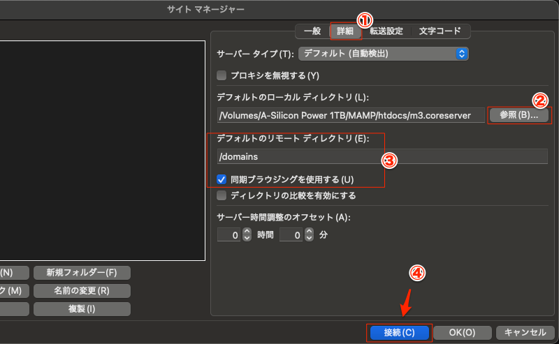 詳細タブでは、②でMacのローカルのディレクトリを選択。③/domainsが契約しているコアサーバーの最初のディレクトリになる。④で接続。