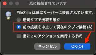 FileZillaの「前の接続を中止して現在のタブで接続(A)」は、すでに別のFTPサーバーへ接続しているタブで新しいサーバーに接続する際、旧接続をクローズして上書き接続する安全機能。