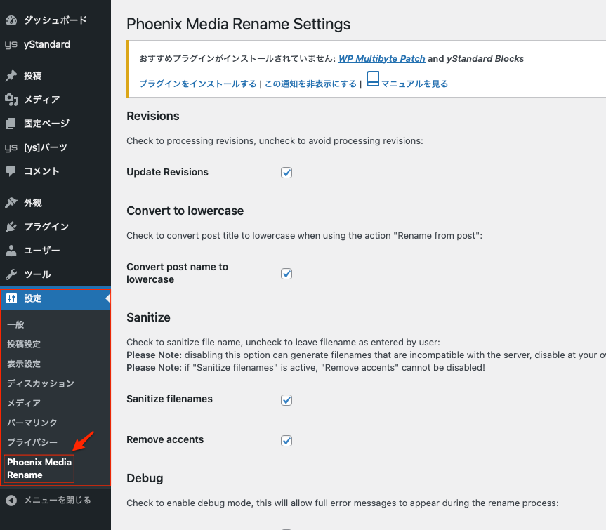 このプラグインの説明は設定 -> Phoenix Media Rename から見ることができる。