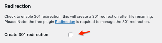 リダイレクト:301リダイレクトを有効にするにはチェックを入れます。これにより、ファイル名の変更後に301リダイレクトが作成されます。