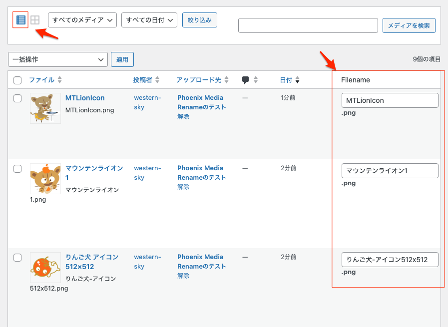 「Phoenix Media Rename」を有効化して、メディアライブラリを開き、リスト表示にすと、メディアライブラリで「Filename」という画像のファイル名を変更する項目が以下のように新たに出現する。
