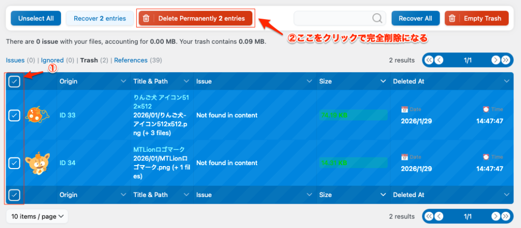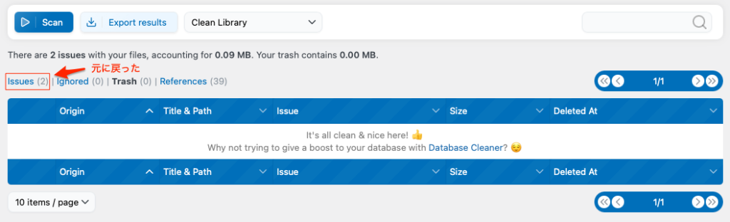 「Issues:問題」はウェブサイトのコンテンツで使われていない(リンク切れ)と判断されたメディアファイルを指し、これらのファイルは安全に削除できるよう一時的に「Trash:ゴミ箱」へ移動させるようにすることが出来るようになっている。