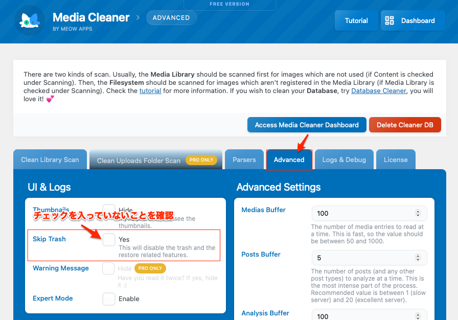 Media Cleanerでファイルをゴミ箱へ移動するには、まず「Settings」の「Advanced」タブで「Skip Trash(ゴミ箱をスキップ)」のチェックが外れていることを確認。