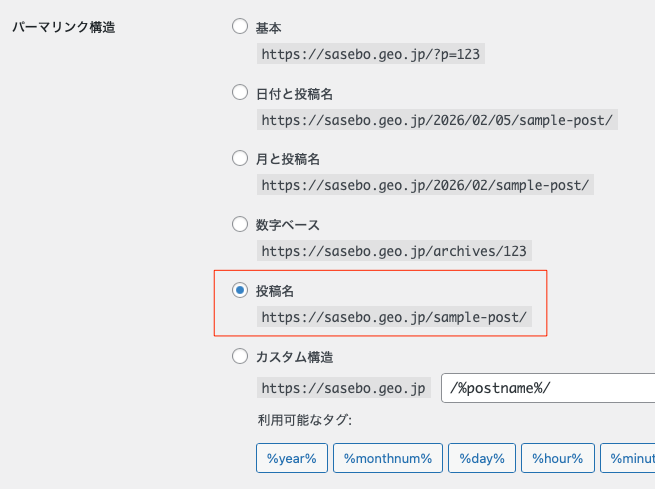 これはパーマリンクを「投稿名」にしたときにどうなるかを検証。
