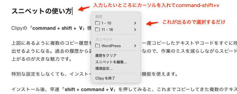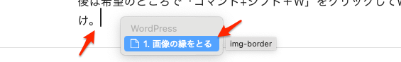後は希望のところで「コマンド+シフト+W」をクリックしてWordPressの中にあるスニペットを選択するだけ。その位置に希望のスニペットのテキストが入力されることになる。