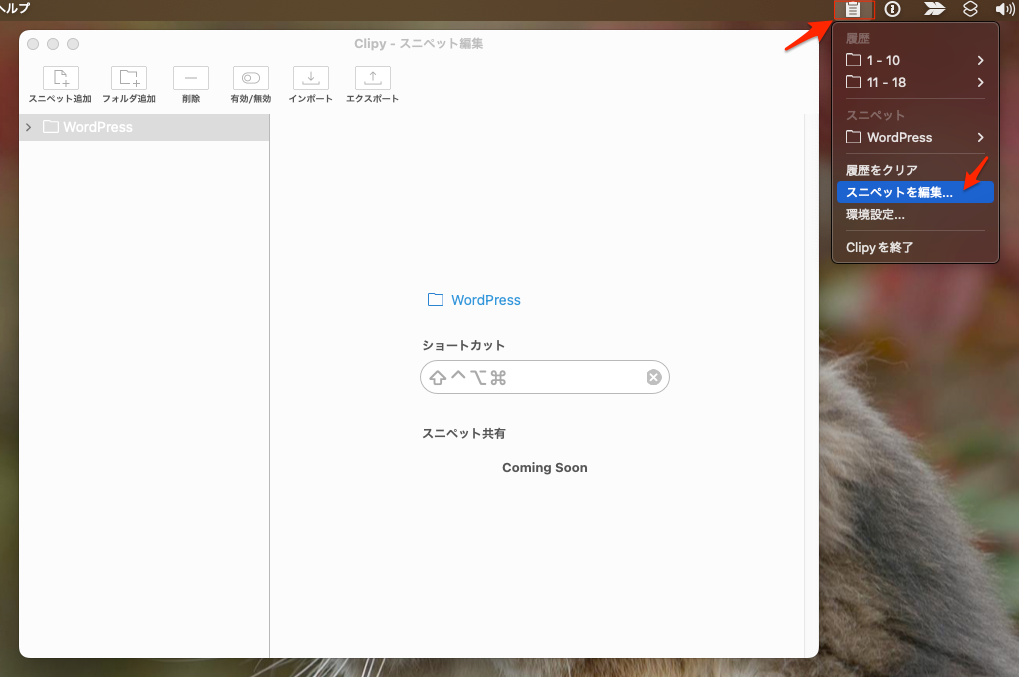 メニューからClipyをクリックしてプルダウンで「スニペット編集」を選択。