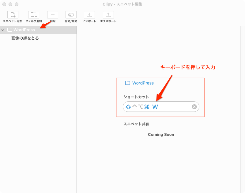 以下では「コマンド+シフト+W」でショートカットを作成している。