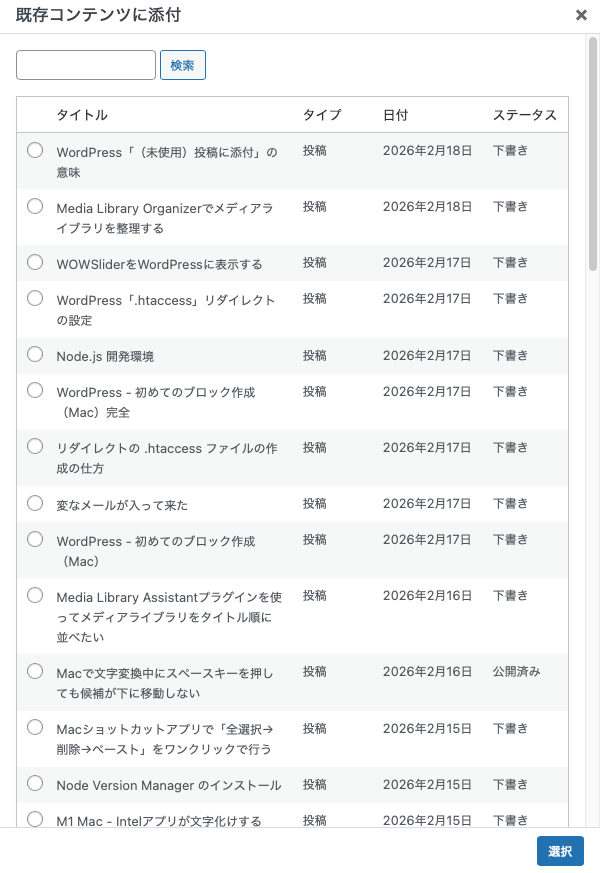 これはこの未使用の画像を別のどれかに添付するという意味らしい。選択して一番下で選択をクリックするとそのページに添付されることになる。