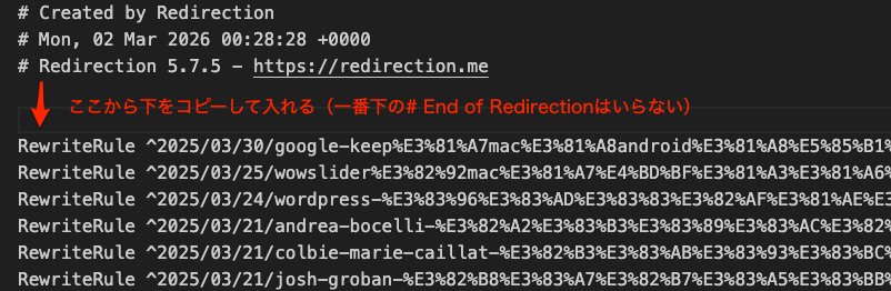 WordPressのプラグイン「Redirection」で作成したリダイレクトルールは、.htaccess形式でエクスポートしてApacheサーバーで使用することができる。