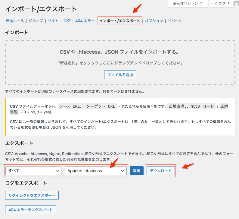 Redirectionの画面上部にあるメニューから「インポート/エクスポート」タブをクリック。