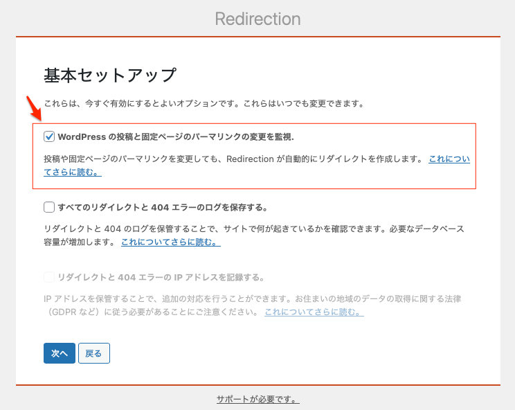 最初の設定で以下のところにチェックを入れると、パーマリンクを変更しても自動的にリダイレクトしてくれることになる。これは別にパーマリンクの設定だけでなくスラッグの変更においても有効で、これは必ずチェックを入れた状態がベストで必須だと思う。