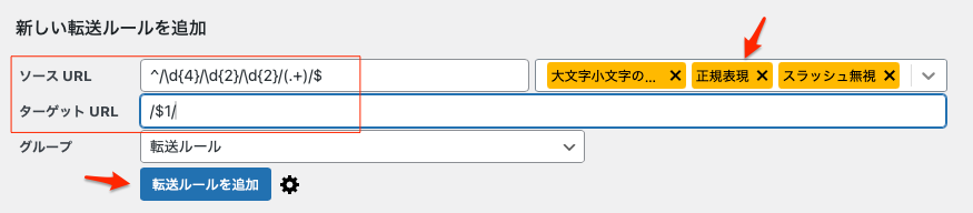 このようにサイト全体で構造(例:日付ベース→投稿名)を変えた場合、ルール設定が複雑になるため、プラグインの正規表現機能を使う必要になる。