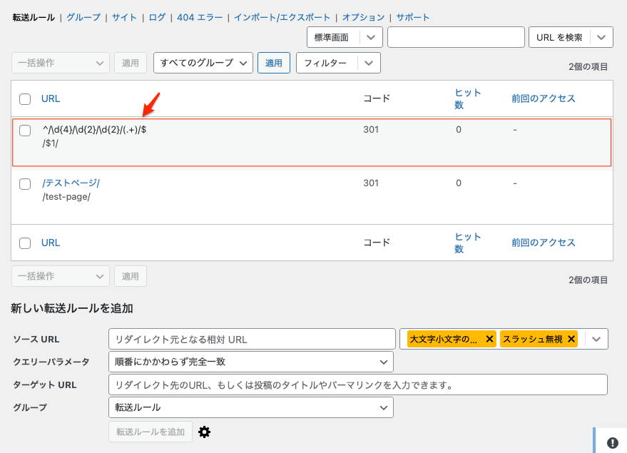 下の「テストページ」の転送ルールは投稿ページのスラッグで日本語を英語に変更した時に、自動的に変更されたものである。