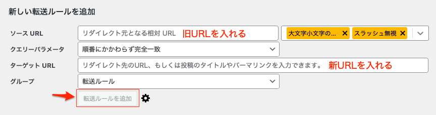 「ソースURL」に旧URLを入力、「ターゲットURL」に新URLを入力。