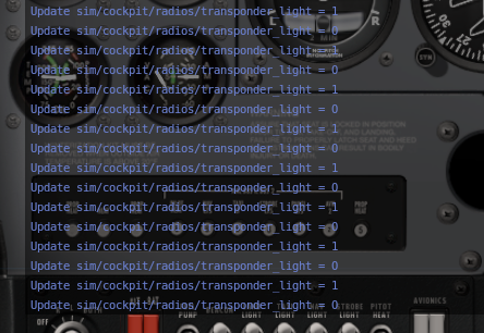 X-PlaneとTeensyが連動しているのがこれで確認できます。1と0で点滅と消灯を繰り返しています。
