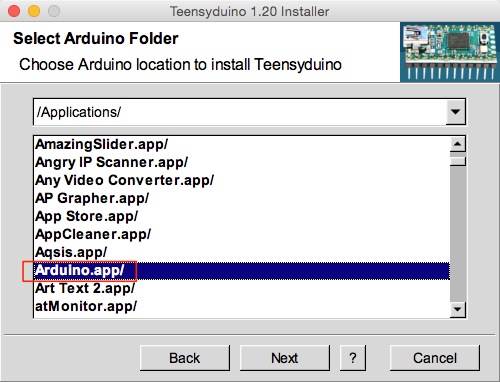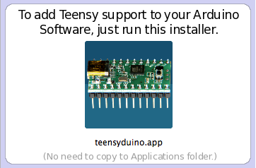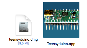 ダウンロードするとdmgファイルになります。ダブルクリックでインストールするとTeensyduino.appができます。インストール先は適当な場所でいいです。
