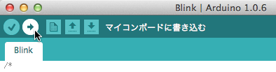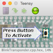 5、開いたBlinkTransponderプログラムを、Teensyボードに書き込むために「Upload」をクリックしてください。