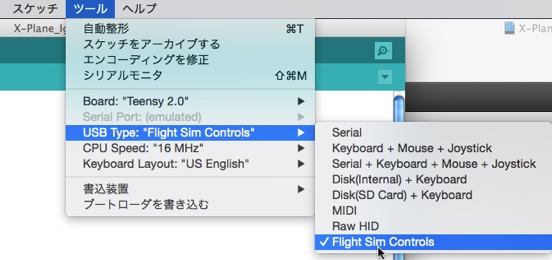 その後、Tools > USBタイプがアクティブになるので、その中のメニューから「Flight Sim Controls」を選択します。