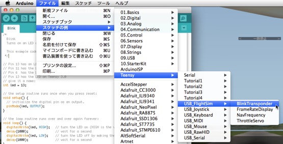 File > Examples > Teensy > USB_FlightSim > BlinkTransponderの点滅(blink)例だが、このように選択するようだ