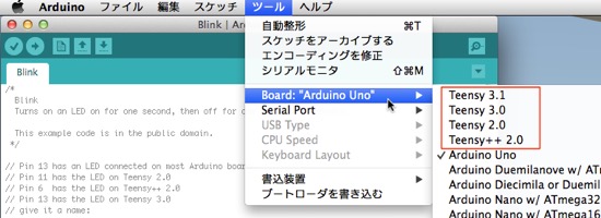 点滅(blink)例を開きます。テストで実際のプログラムをTeensyに入れて実行してみます。