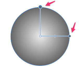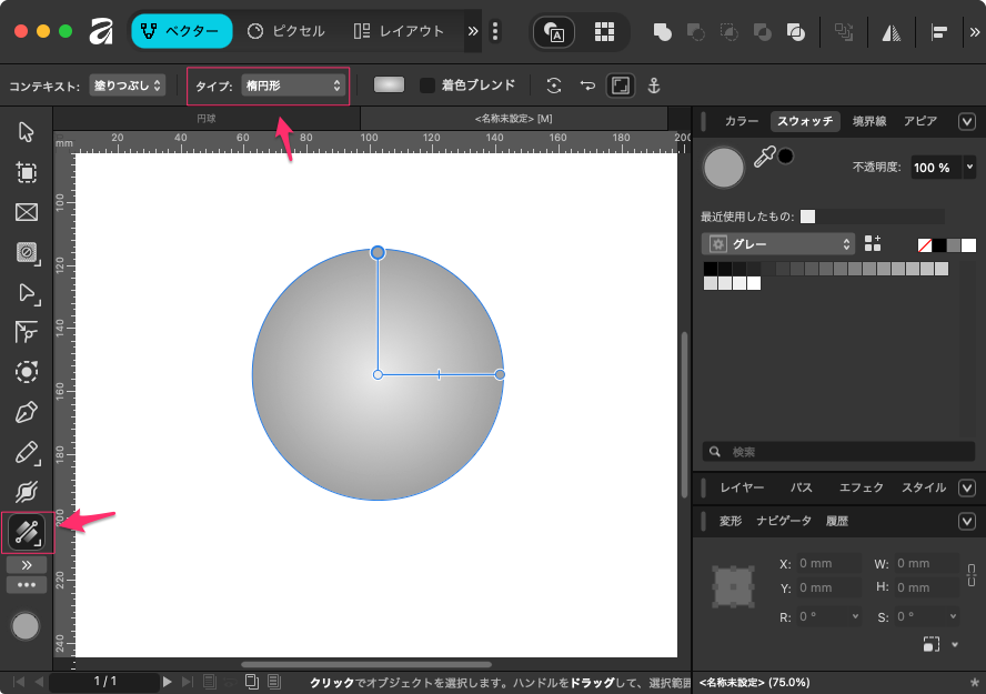 塗りつぶしツールを選択、タイプのところで「楕円形」を選択。以下の様に90度のハンドルが表示される。