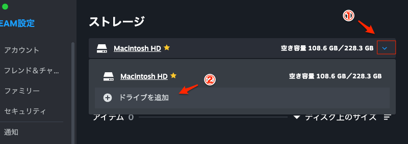 画面上部の①のドライブ選択プルダウンをクリックし、②「ドライブを追加」を選択して、X-Plane 12をインストールしたい新しいドライブを指定する。