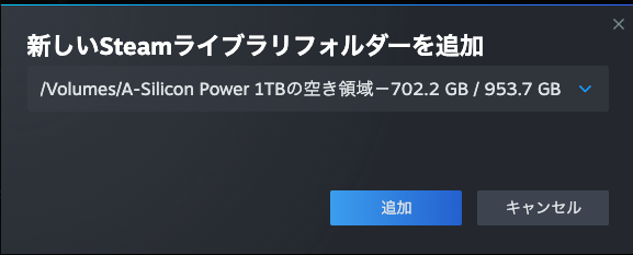 インストールダイアログ内の「インストール先を選択」プルダウンから、手順1で追加した新しいドライブを選択します。