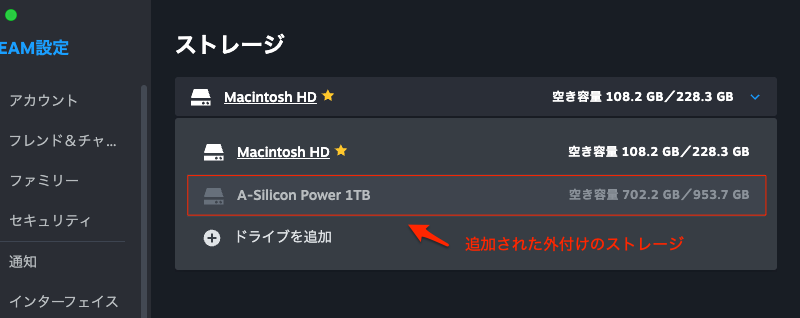 下の追加したA-Sillcon Power 1TBストレージをクリックして選択する。